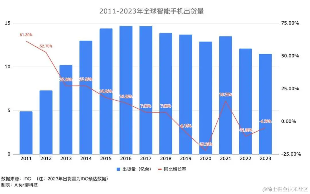 尽管不同调研机构的口径有所不同,但普遍认为出货量巅峰在2017年前后,之后市场开始进入下行周期。因为5G等新技术的出现,全球智能手机出货量在2021年短暂复苏,却未能持续太长时间。按照IDC的统计报告,2022年全球智能手机出货量同比下降11.3%,预计2023年的出货量比2022年减少4.7%,将创造10年以来的销量新低。