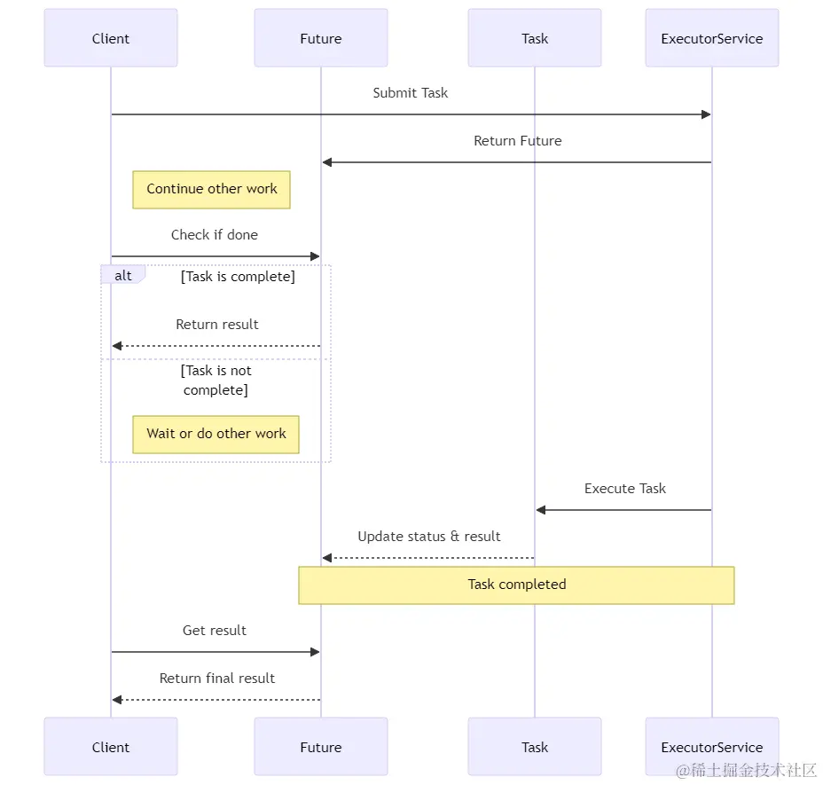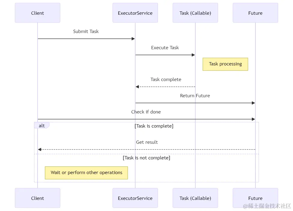 在这个例子中,小黑使用了一个线程池 ExecutorService 来提交 MyCallable 任务。submit 方法会返回一个 Future 对象,咱们可以用它来获取任务的结果。注意,future.get() 会阻塞,直到任务执行完成,所以如果任务很耗时,咱们可能不想在主线程中调用它。