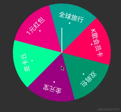 幸运转盘在很多app包括掘金客户端中都有,也有很多现实的例子,不过这个难度并不是如何让转盘转起来,真正的难度是如何统一个方向转动,且转到指定的目标区域(中奖概率从来不是随机的),当然还不能太假,需要有一定的位置偏移。