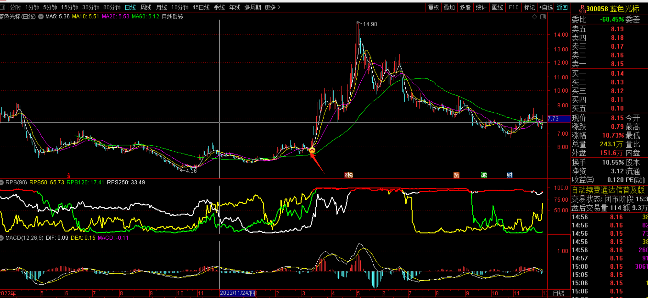 - 45天内,至少有一天的最低价低于250天线;且至少站上250天线3天以上