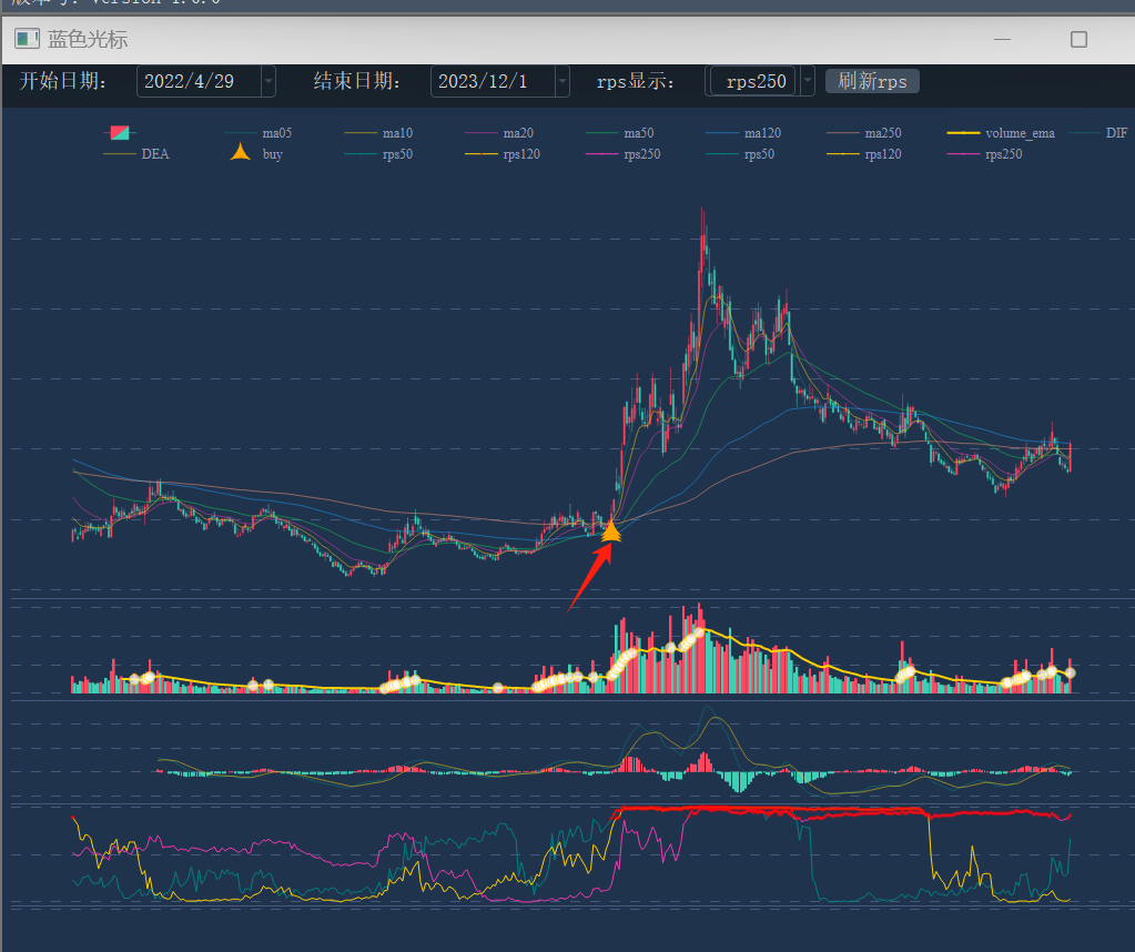 这 python 化的代码到底准不准?我们验证一下出现买点的时间是否和通达信一直即可。由于我的量化系统已经实现了买点标注的功能,验证相对简单。我对比了很多个票,买点位置都是可以对得上的,所以上面的代码是问题不大的。