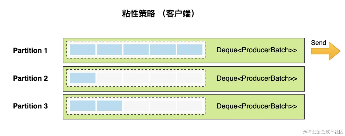 粘性分区策略就是在相同的分区中,优先填满一个ProducerBatch,发送,再去填充另一个ProducerBatch。参见下图,第一个分区会被优先塞满并发送。