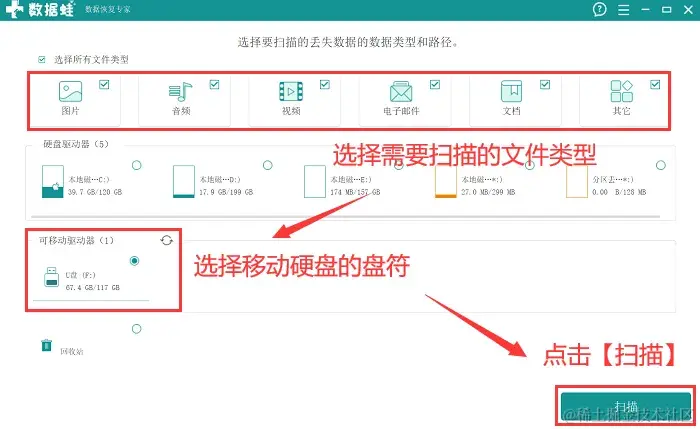 第2步:用户可以对需要进行扫描的文件类型进行勾选,并在可移动驱动器下选择 【移动硬盘】的盘符,点击【扫描】 ;