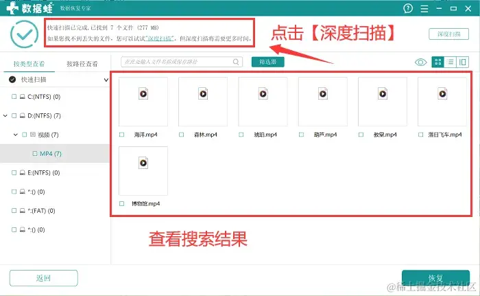 第3步:第一次扫描完成后,用户可以对快速扫描的结果进行查看,可以按照类型查看,也可以直接按照路径进行查看,如果文件呈现较少,点击【深度扫描】 ;