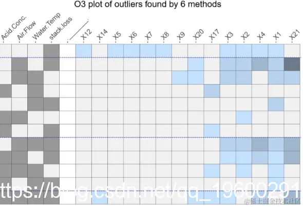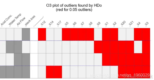 Stackloss数据集的O3图。每个变量组合(由左边的列定义)一行,找到了异常值,并将每个案例的一列标识为异常值(右边的列)。