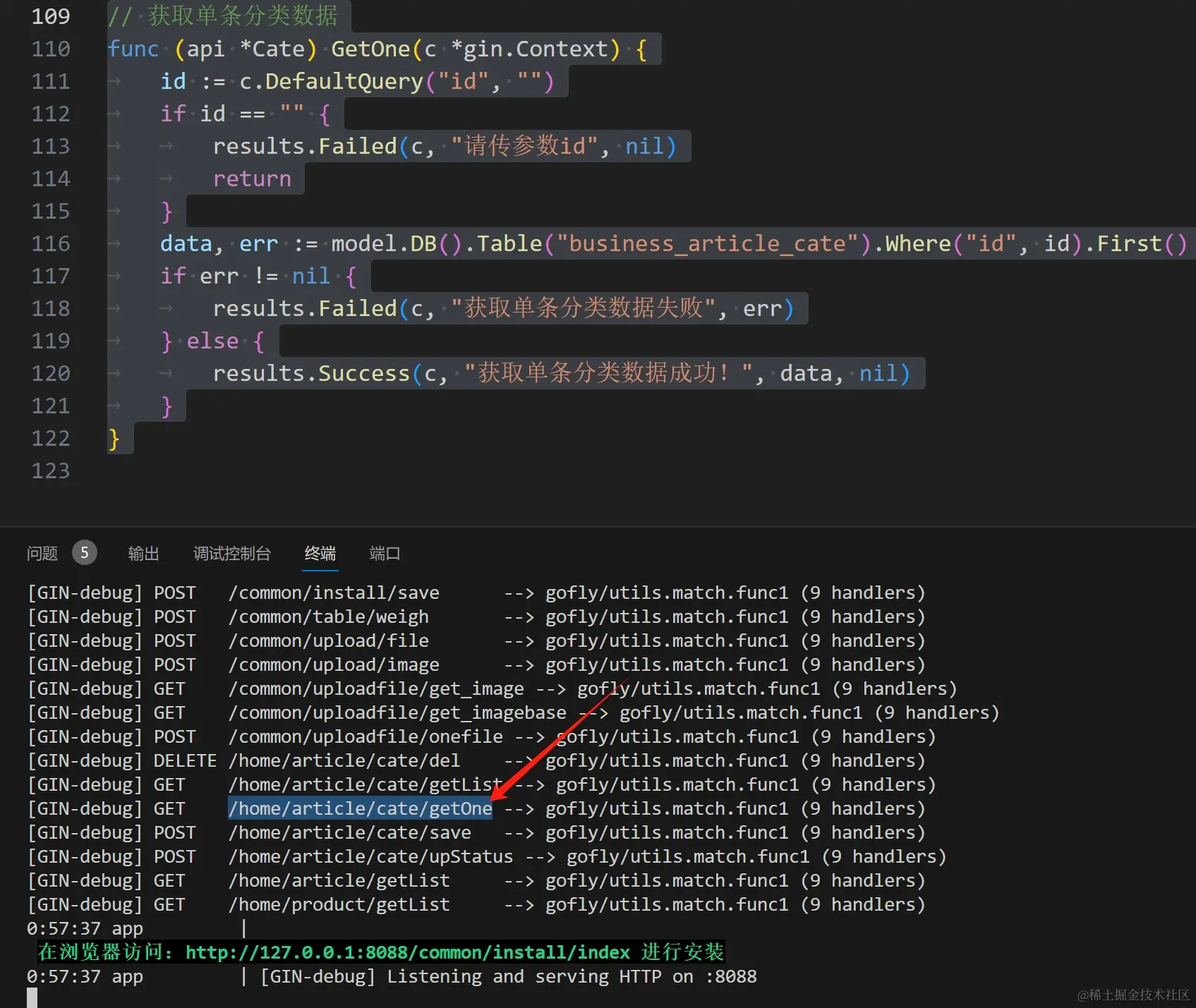 保存后我们看到重新编译的终端打印出新增的方法api请求路径: