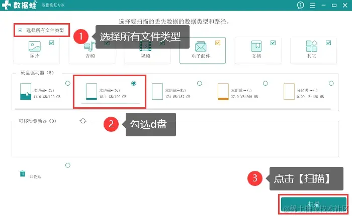 步骤2:勾选需要恢复的文件类型(建议用户全选),并勾选【d盘】,点击【扫描】;