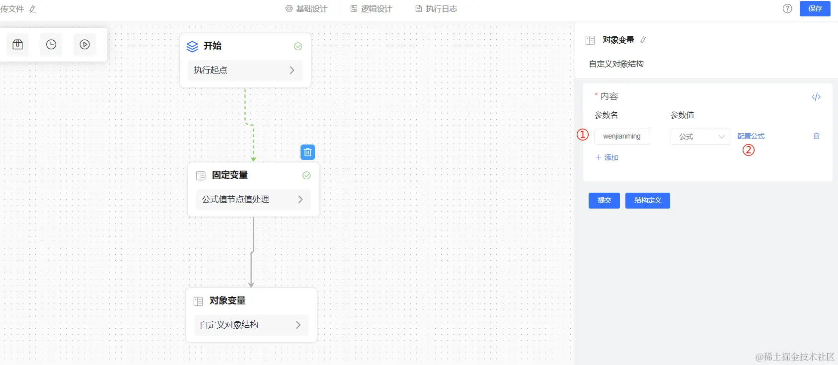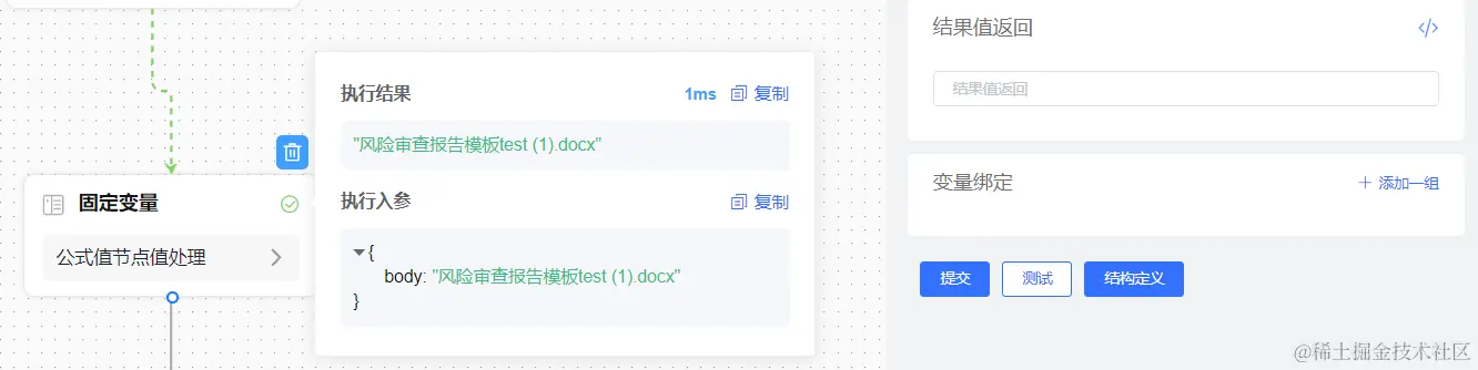 3、使用对象变量,将拿到的【固定变量】节点返回值赋给表单字段,即可回显。
