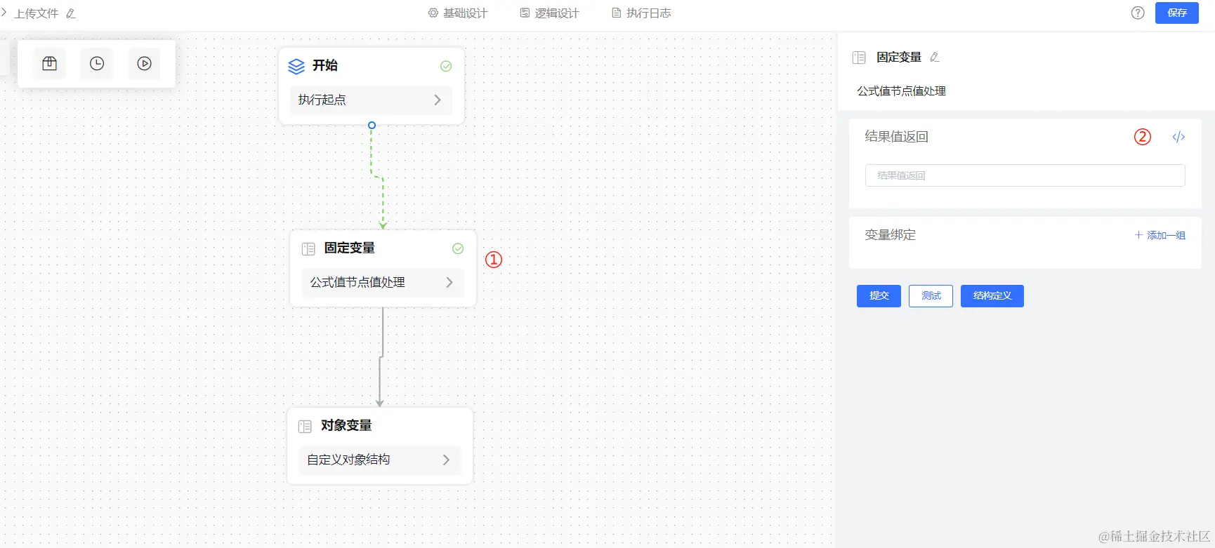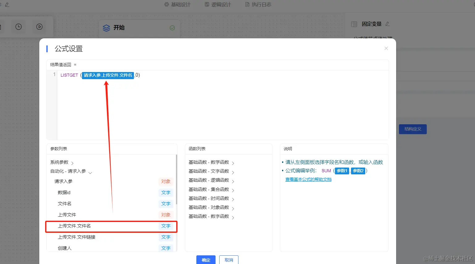 2、先使用一个【固定变量】节点通过函数获取表单传过来的数据中的文件名称。由于传过来的文件对象数据是一个数组,所以需要使用LISTGET函数取出第一个元素。