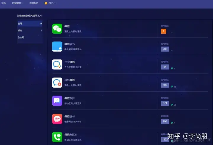我们可以用Talkingdata来查看移动应用排名,可以查看单款应用绘制出的人群画像、也可以通过分析查找到人气较高的微信公众号、另外还可以监控应用在市场上的排名动态变化。数据报告也可以为我们所关注的行业提供参考依据,确实一款不错的移动数据观象台。