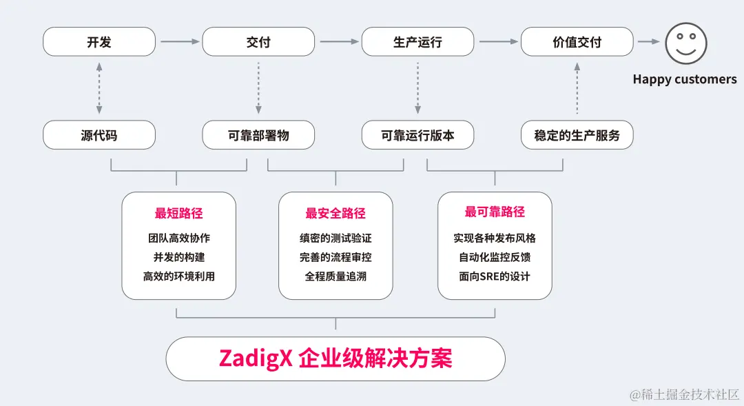对于企业客户,我们用 ZadigX 品牌代表包含企业级功能和专业服务的解决方案,"X"代表为企业客户提供更高质量的服务和保障,根据企业的具体难点和需求,接下来我们会面向企业推出一系列 DevOps 专家培训、DevOps 效能提升、云原生转型、IT 数字化升级等企业级解决方案。
