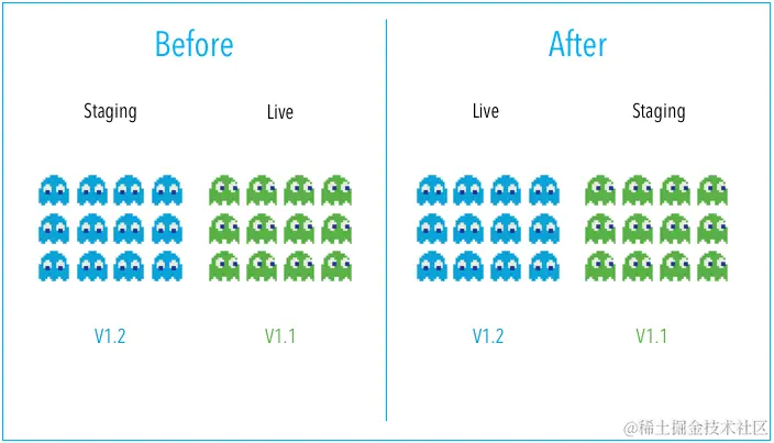 - 人工验证完成后,完成发布将所有流量切流到蓝环境,并且将原有的绿环境实例移除