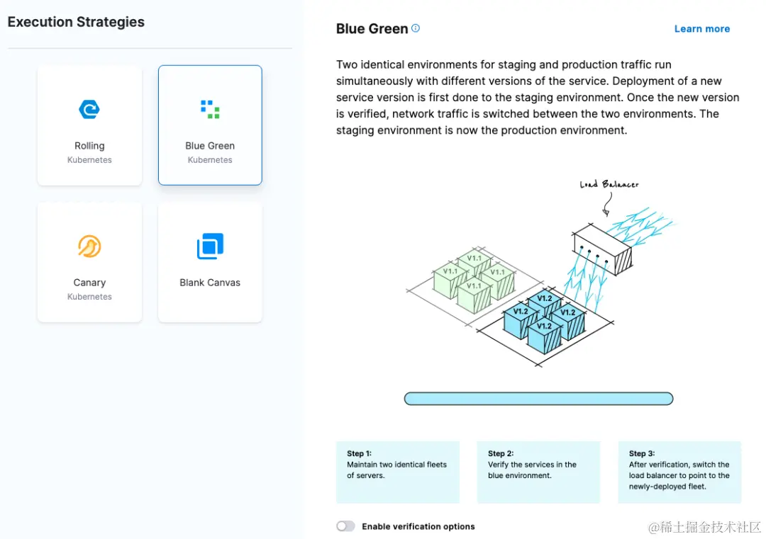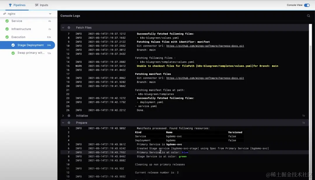 Harness 支持蓝绿发布、滚动发布、金丝雀发布等发布策略,支持 Deployment 、 Statefulset 工作负载,通过 K8s 原生 Service 做流量控制,下面以蓝绿发布为例,简单介绍 Harness 蓝绿发布的执行过程,具体原理可参考官方文档。
