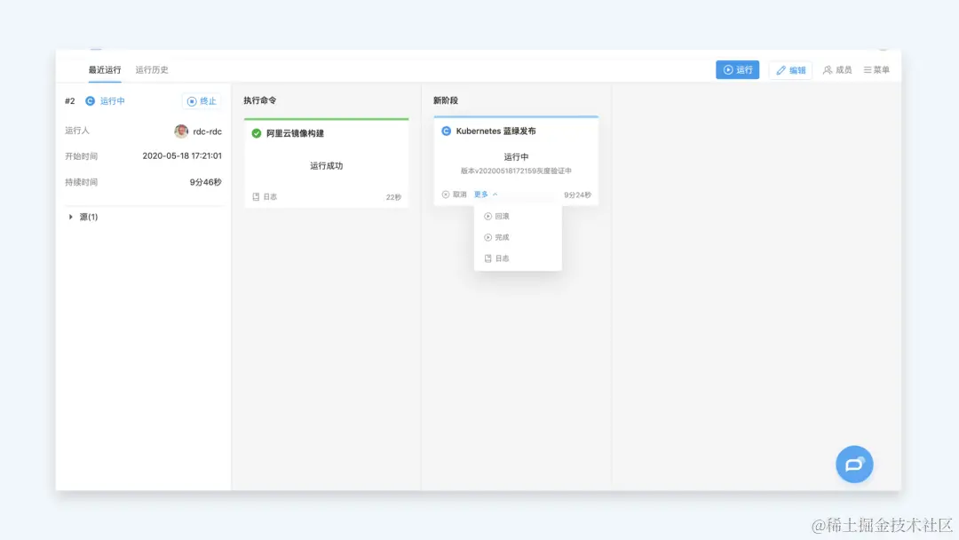 执行流水线,触发蓝绿发布,通过 Cookie 标访问新版环境进行功能验证,验证没问题,点击「完成」,流量切到新版本;验证有问题则点击「回滚」。