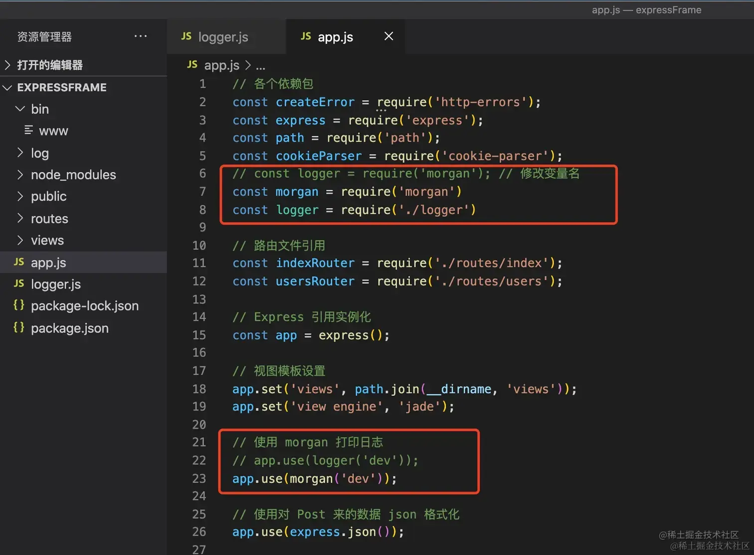 相应的也要把 app.use(logger('dev')); 改成: