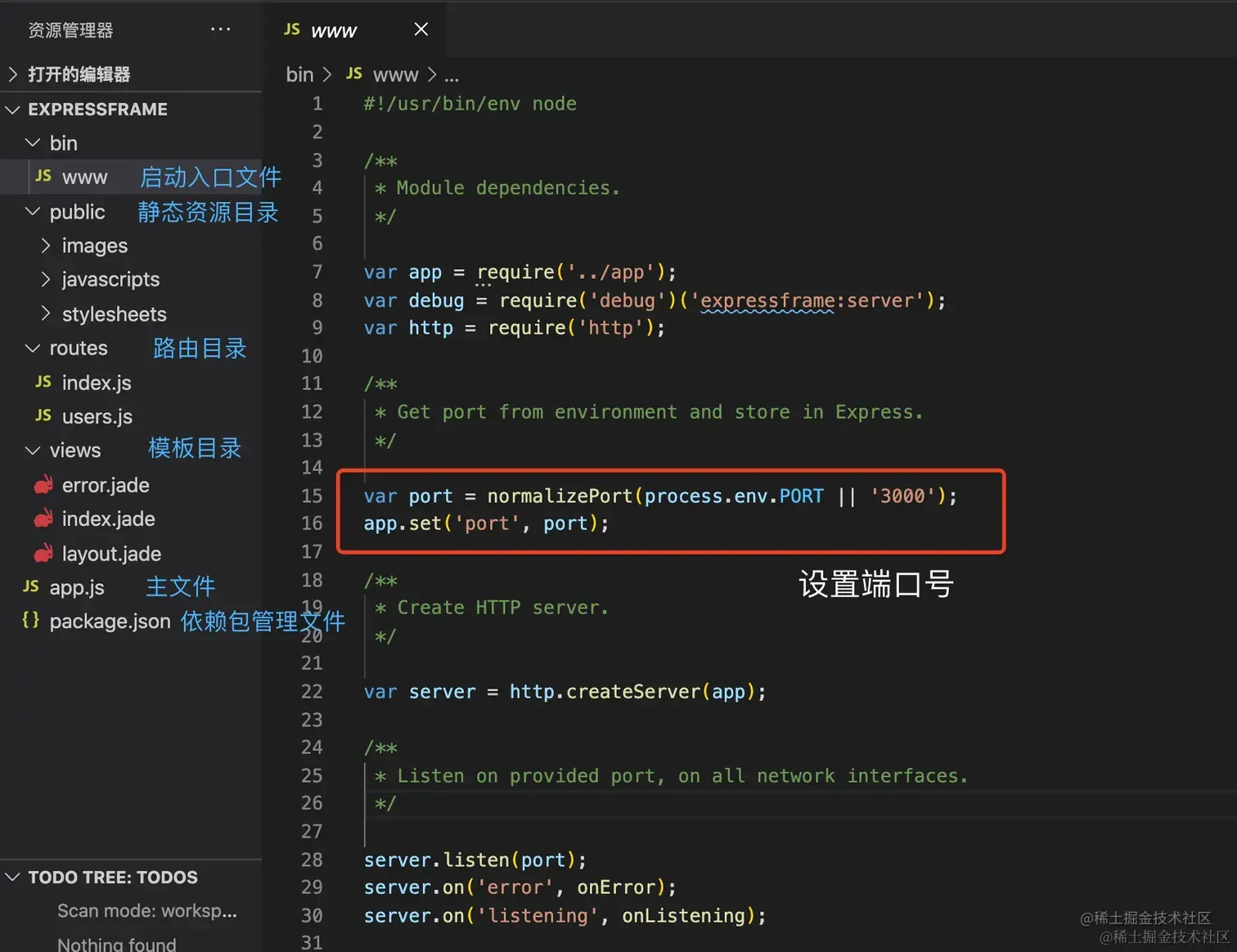 bin/www 是启动入口文件,在里面可以设置端口号等