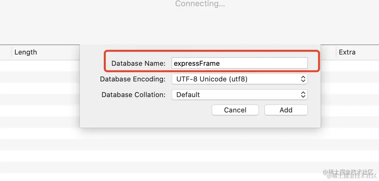 使用数据库管理工具新建数据库 database 名称为: expressFrame