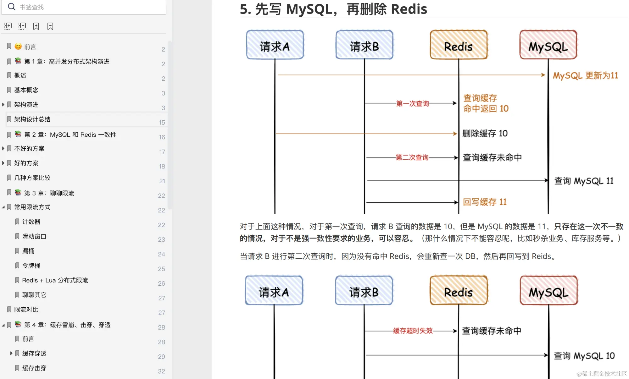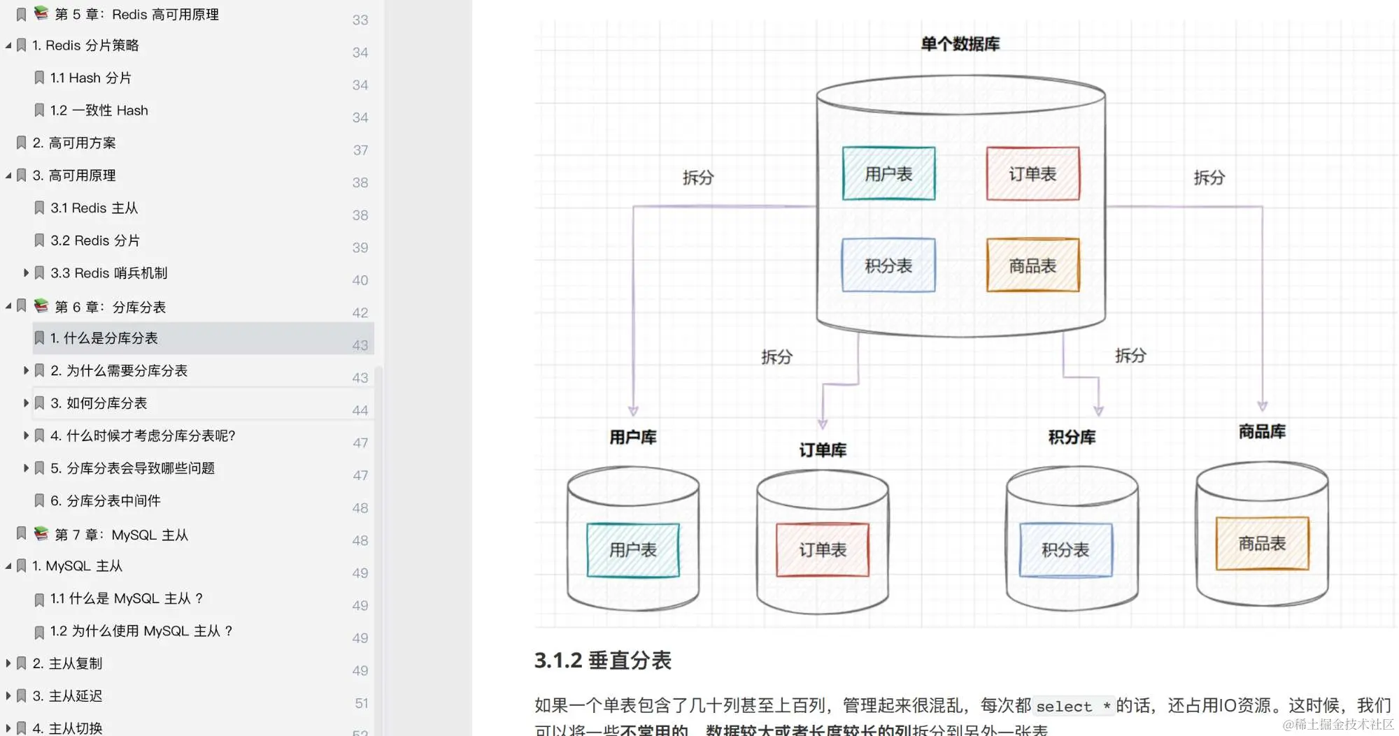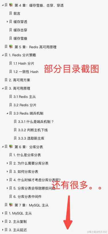 比如高并发手册,总共 7 章:高并分布式架构、MySQL 和 Redis 一致性、限流、缓存击穿/穿透/雪崩、Redis 高可用、分库分表、MySQL 主从。