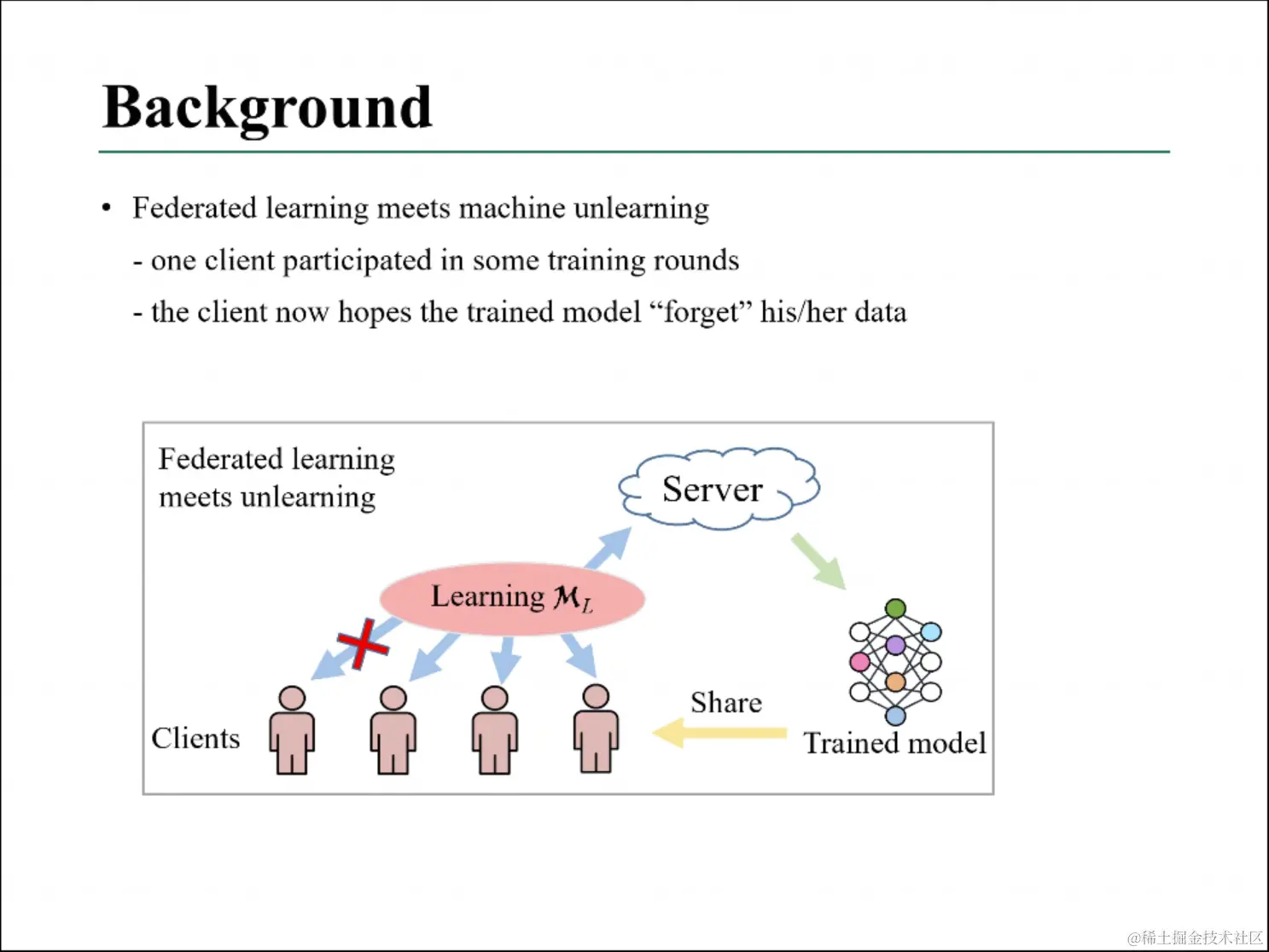 - 联合学习中的客户端是不断变化的。服务器几乎无法调用以前的客户端来执行忘记操作,更不用说从头开始重新训练了。
