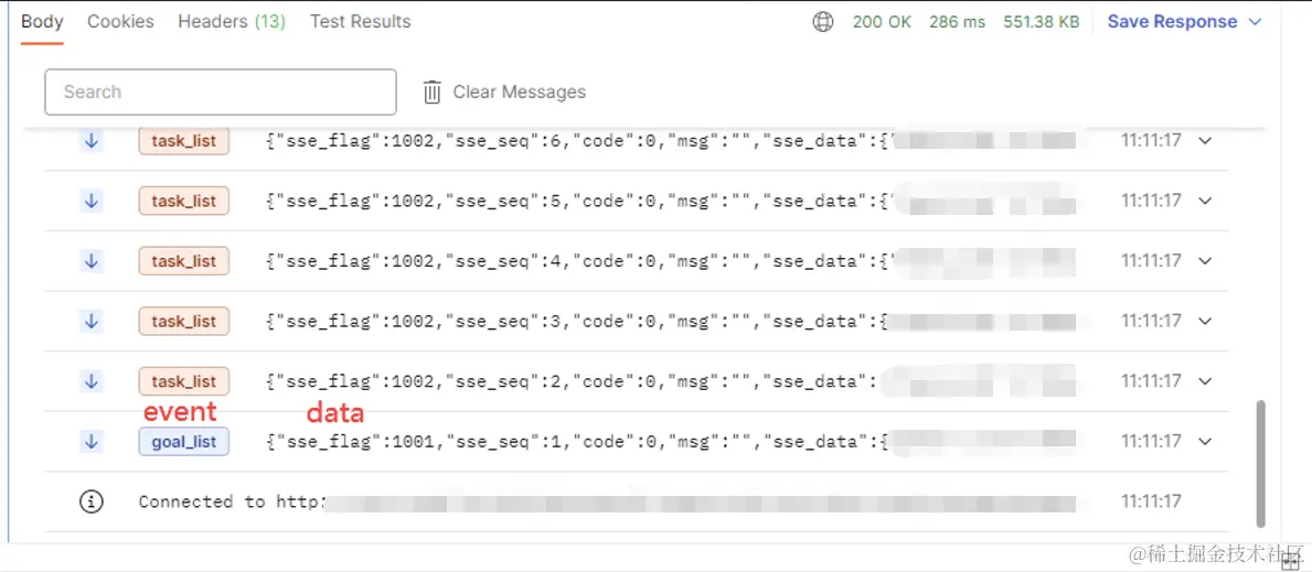 遵守事件流规范的响应,可以通过 postman 很直观的看到它的响应内容: