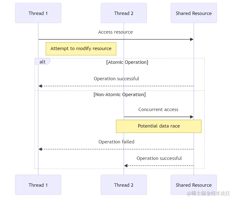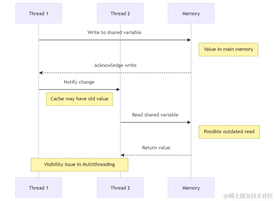 线程1(Thread 1) 向共享变量写入数据。 数据被写入主内存(Memory)。 主内存确认写入操作。 线程1通知线程2关于变量的更改。 线程2(Thread 2) 可能仍然在其缓存中有旧值。 线程2尝试读取共享变量。主内存返回的值可能是过时的。