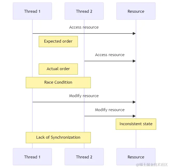 - 由于没有同步机制,两个线程的访问顺序变得不可预测,导致竞态条件(Race Condition)。