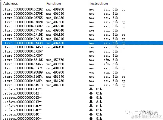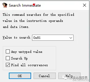 什么时候会需要搜索常数呢?一般是在你找到了某个特征的时候,比如我想看有系统调用的地方,那么我们可以搜索,0x81,为啥是这个值呢?可以去看 x86 汇编相关知识。