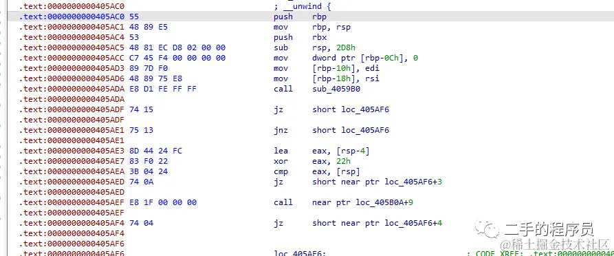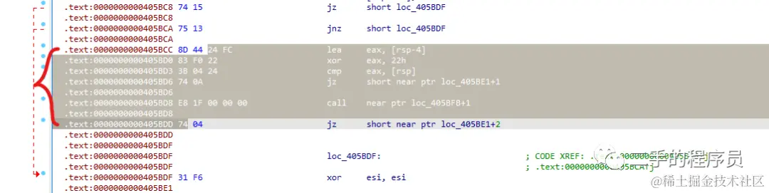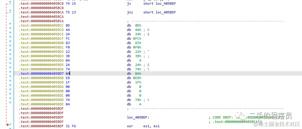 发现code指令里面存在这种奇怪的指令,jz与jnz构成了一个绝对跳转,也就是无论 zf flag 的值是啥,都会跳转到 loc_405AF6。同时观察到,没有别的线条指向这些指令的中间位置,也就是说中间的指令不会被用到,我们可以将这些指令替换成 nop 指令。
