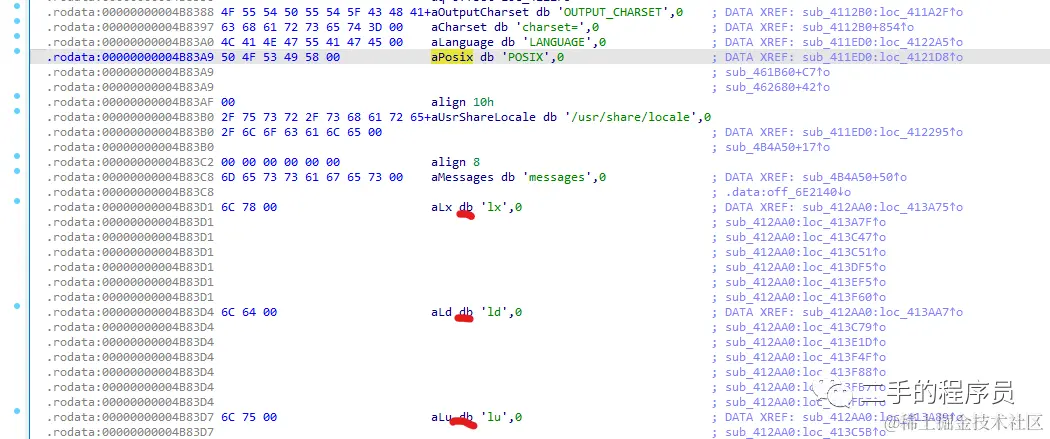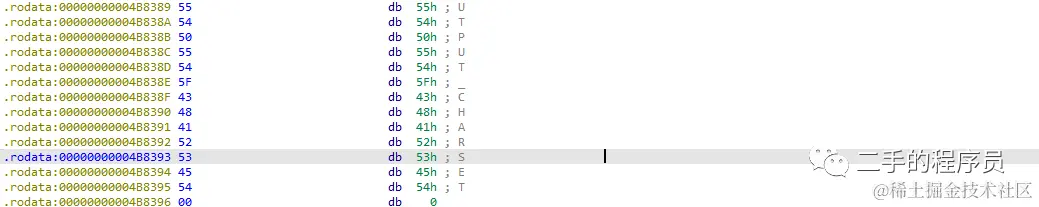 我们看上图中的字符串,它们其实储存的方式也是一个一个的字节,只不过 ida 帮我们显示的漂亮了,可以算一下两个字符串之间的地址距离。