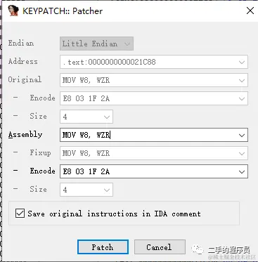 修改汇编代码:Keypatch(得保持指令字节不变,不然so格式就乱了)。