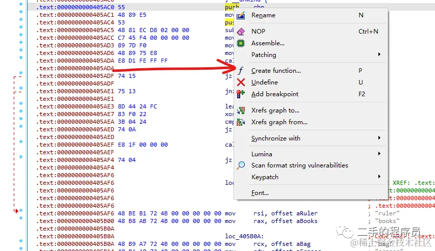 如果没有出现这个提示,大概率是fill nops 搞错了,再重新来一次吧。弹这个窗是因为我们还需要为这块代码创建一个函数,按 P 键,或者右键选择创建函数:
