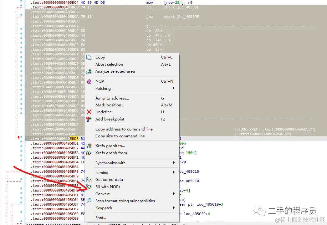 注意要多选中一条指令,因为 Fill with NOPs 选项是不会替换选中的最后一条指令的。替换完成的效果如下: