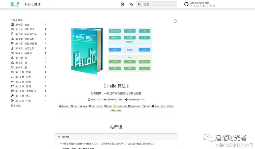 - 项目简介: Hello算法一个开源免费、新手友好的数据结构与算法入门教程。全书采用动画图解,内容清晰易懂、学习曲线平滑,引导初学者探索数据结构与算法的知识地图。源代码可一键运行,帮助读者在练习中提升编程技能,了解算法工作原理和数据结构底层实现。支持 Java, C++, Python, Go, JS, TS, C#, Swift, Rust, Dart, Zig 等语言。