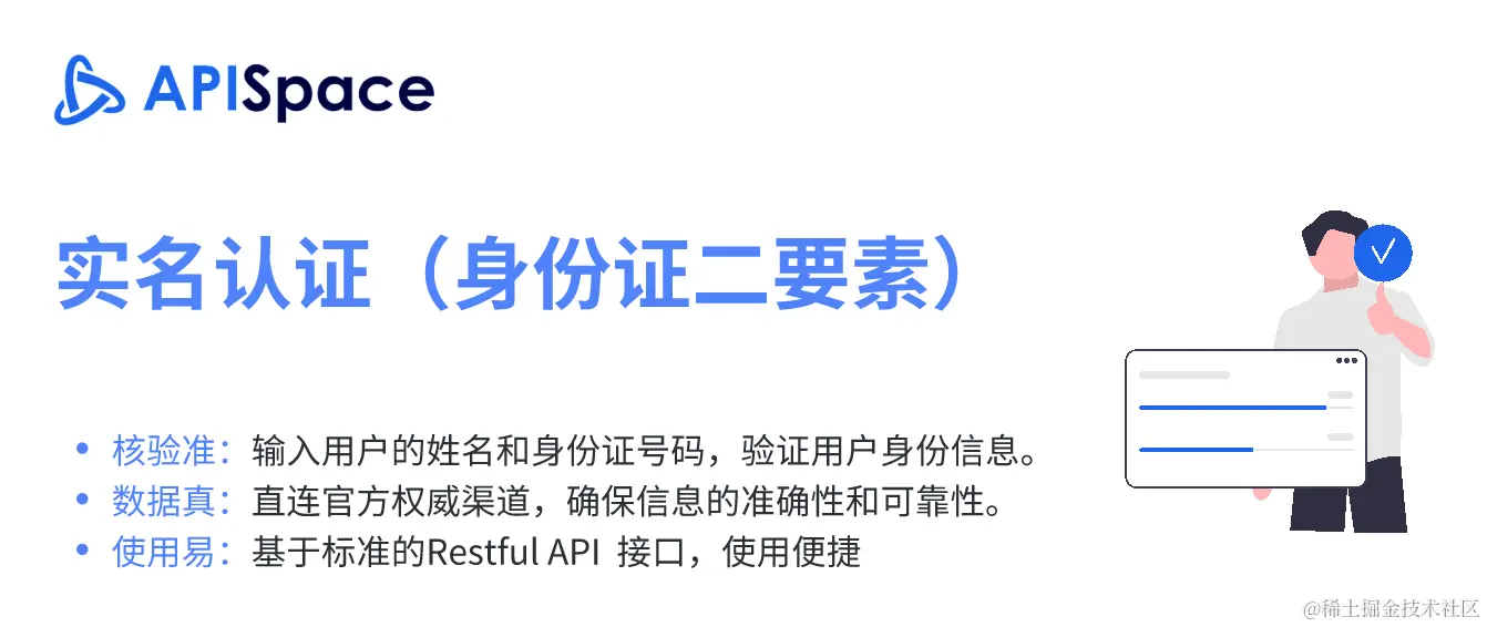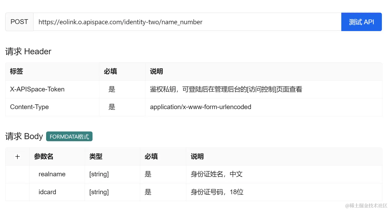 APISpace 的 实名认证(身份证二要素API),核验身份证二要素(姓名和身份证号码)信息是否一致。