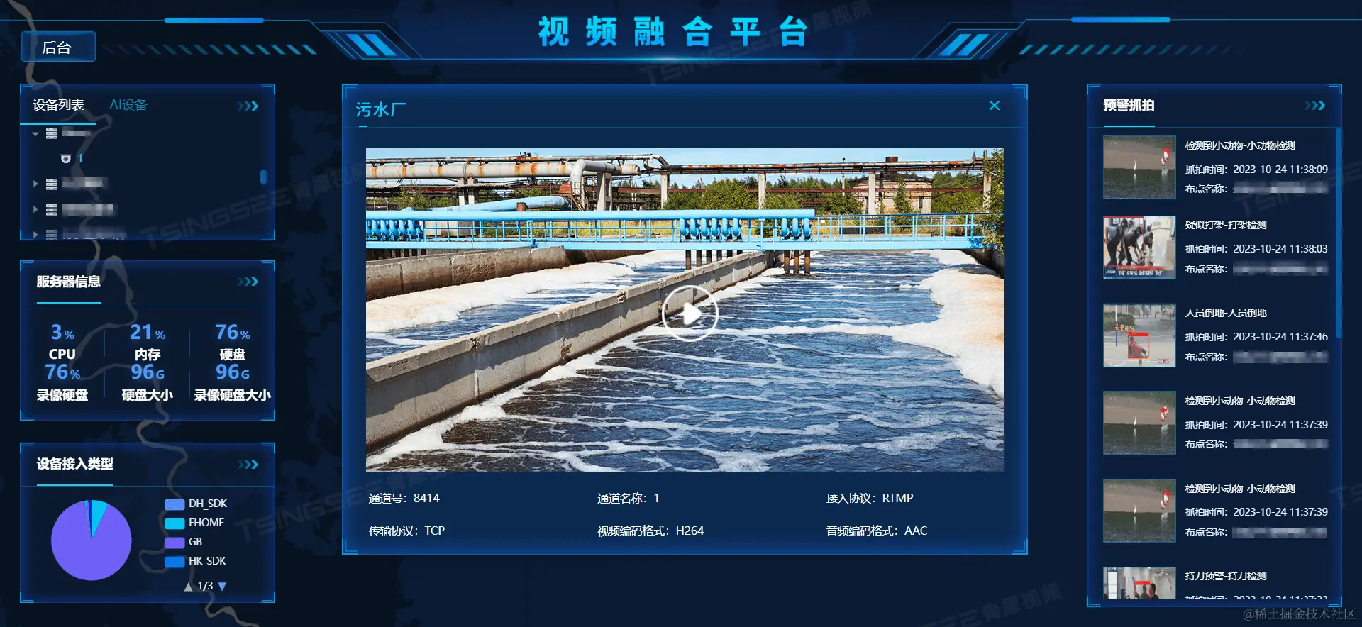 安防视频监控/视频集中存储/云存储/磁盘阵列EasyCVR平台可拓展性强、视频能力灵活、部署轻快,可支持的主流标准协议有国标GB28181、RTSP/Onvif、RTMP等,以及支持厂家私有协议与SDK接入,包括海康Ehome、海大宇等设备的SDK等。平台既具备传统安防视频监控的能力,也具备接入AI智能分析的能力,可拓展性强、视频能力灵活,能对外分发RTMP、RTSP、HTTP-FLV、WebSocket-FLV、HLS、WebRTC等视频流。