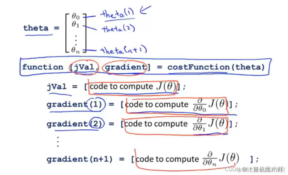 所以在实现这些高级算法,其实是使用不同的高级库函数,虽然这些算法在调试过程中,更加麻烦,但是其速度远远大于梯度下降,所以面对机器学习问题中,往往使用这些算法。