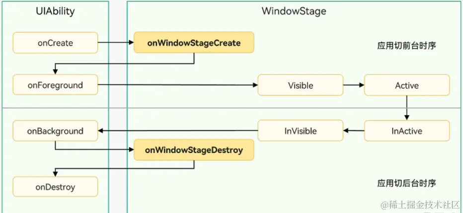 在应用加载过程中,onCreate()回调表示Create状态,之后进入Foreground状态前会触发onWindowStageCreate()回调,然后在切换至后台和销毁时分别触发onBackground()和onDestroy()回调。
