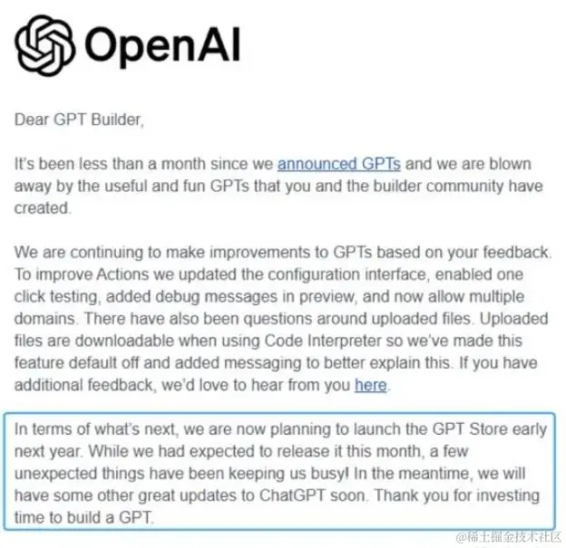 就像ChatGPT团队在向GPT开发者发布的公开信说的那样:“虽然我们原本打算这个月就发布GPTs商店,但……一些意料之外的事情让我们忙得不可开交!”