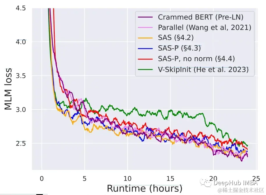 论文的简化块,特别是当与归一化相结合时,在24小时的训练限制内匹配了Pre-LN基线的预训练速度,如下图所示。但在不修改值和投影的情况下删除跳过连接,会显著降低训练速度。