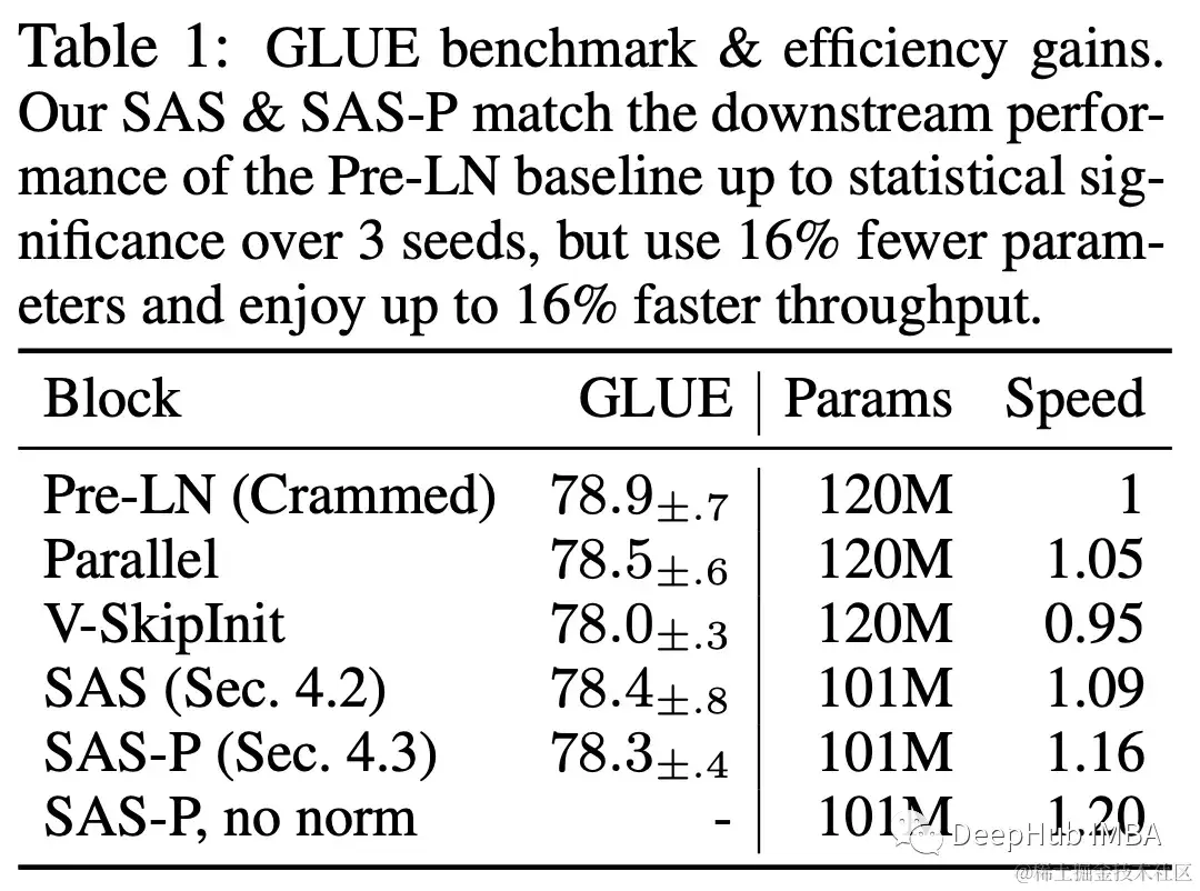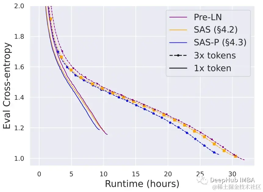 为了适应在更多数据上训练更长时间的小模型的趋势,论文使用简化块进行了实验。当使用3×令牌(约2B个令牌)训练时,简化的SAS和SAS- p块保持或超过Pre-LN块的训练速度,如下图所示。