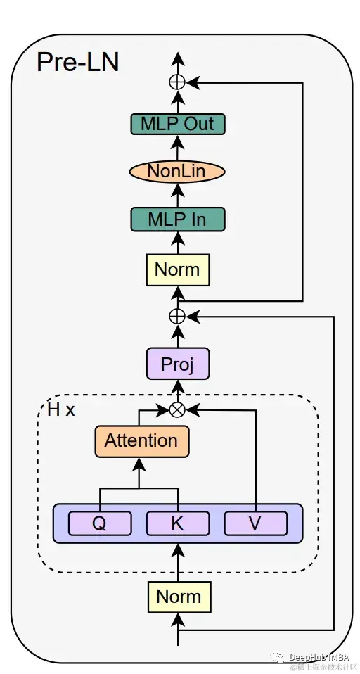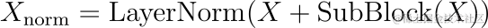 LayerNorm为层归一化操作,X为层的输入,SubBlock(X)表示子块(MHA或MLP)内的操作。