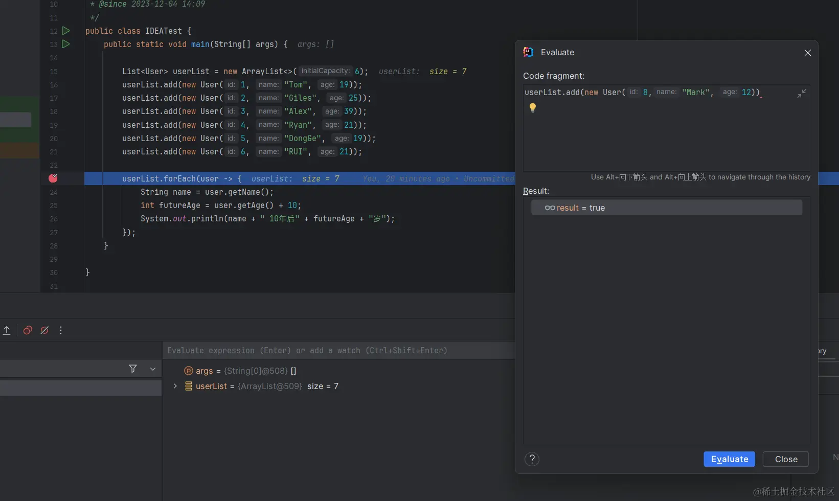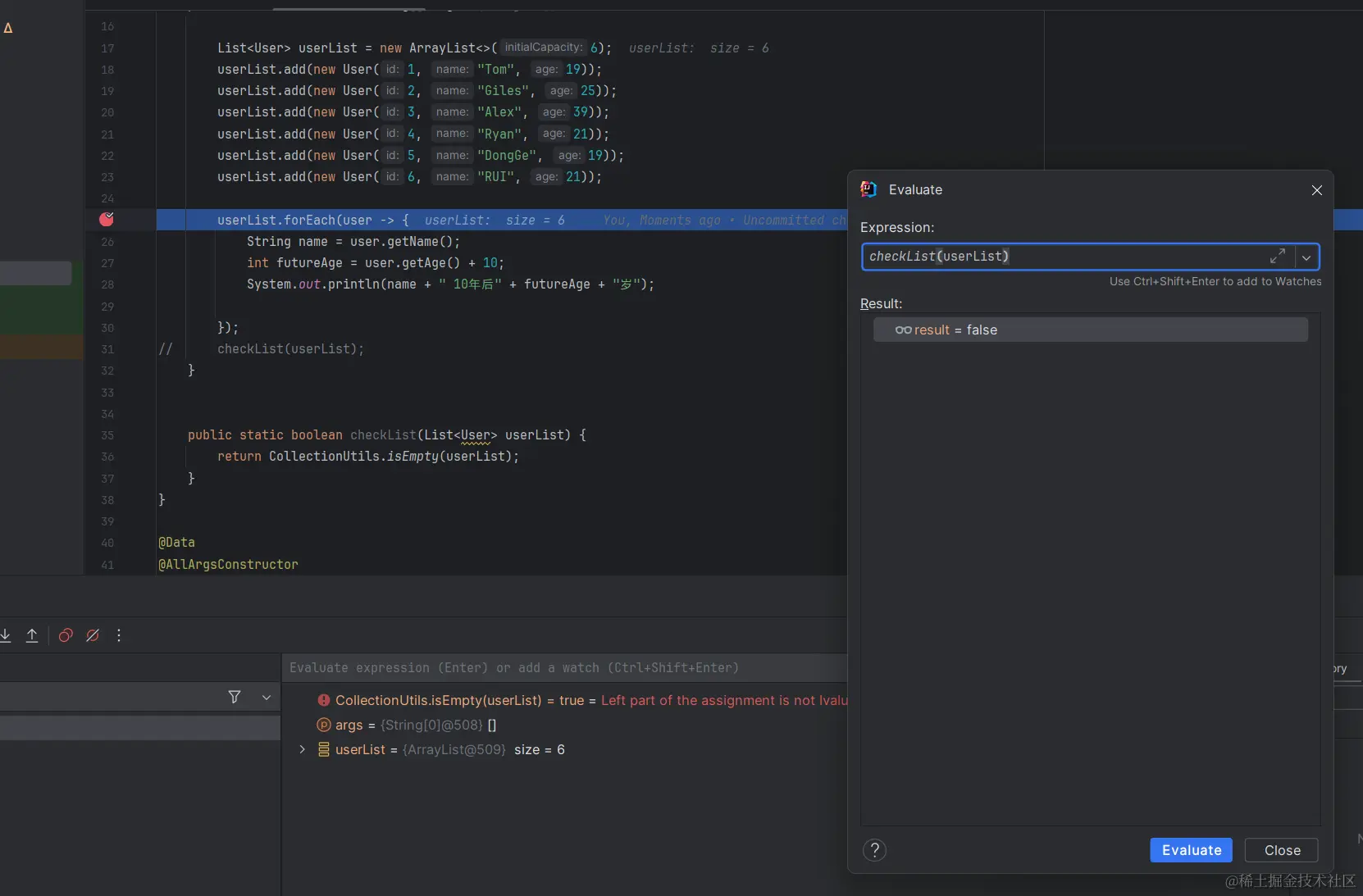 userList.add(new User(6, "RUI", 21));