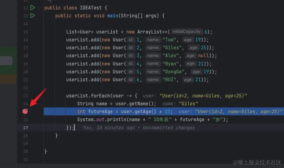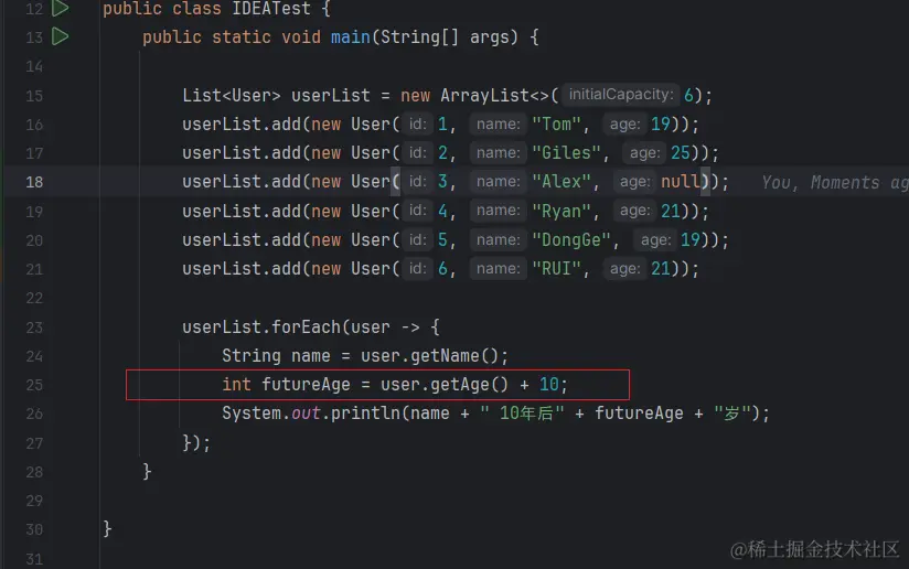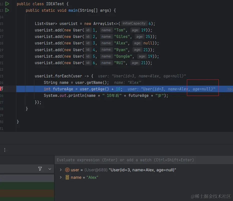 我们构造一个List<User>用来模拟从数据库查询出列表,第三个元素id=3中的age属性是null,我们在for循环中使用加法来触发Integer类型的拆箱来出发空指针异常。