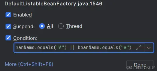 例如,我们在阅读Spring Framework源码时,条件断点可以帮助我们快速定位到正在目标Bean。