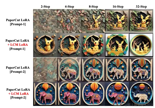 他们在研究中通过将针对特定绘画样式进行微调的LoRA参数与LCM-LoRA参数相结合的例子来证明这一点。这种组合允许在不同的采样步骤(比如2步、4步、8步、16步和32步)创建样式迥异的1024 × 1024分辨率图像。它们表明,这些组合的参数无需进一步训练即可生成高质量图像,强调了这种模型的效率和通用性。