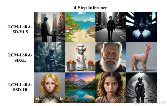 图2、论文声称:“使用从不同的预训练扩散模型中提取的潜在一致性模型生成的图像。我们使用LCM-LoRA-SD-V1.5生成512×512分辨率的图像,使用LCM-LoRA-SDXL和LCM-LoRA-SSD-1B生成1024×1024分辨率的图像。”