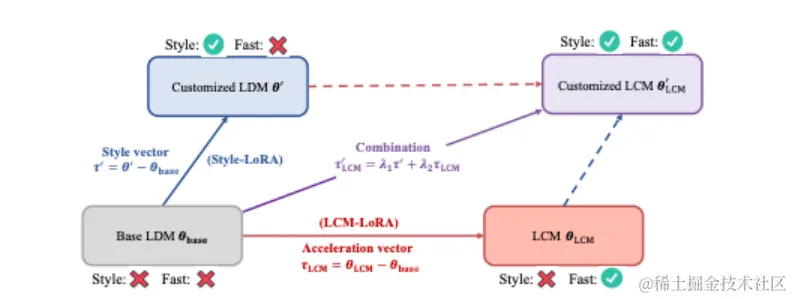 这里值得关注的一个地方是使用所谓的“加速向量”(τLCM)和“样式向量”(τ),两者使用特定的数学公式(λ1和λ2是这些公式中的可调整因子)组合在一起。这种组合产生的模型可以快速地生成定制样式的图像。