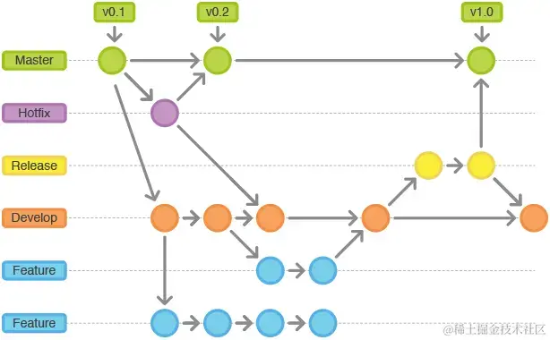 对外发布的工作完成后,发布分支会合并到master分支并分配一个版本号打好Tag。另外,这些从新建发布分支以来的做的修改要合并回develop分支。