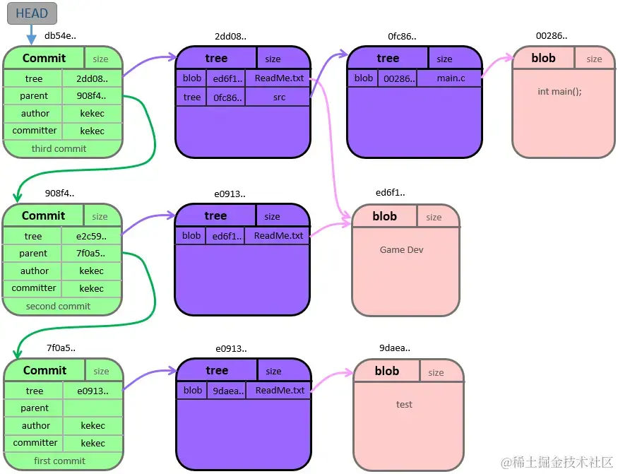 tree -- 表示1个目录,记录着目录里所有文件blob哈希值、文件名子目录名及其他元数据。通过递归引用其他目录树,从而建立一个包含文件和子目录的完整层次结构