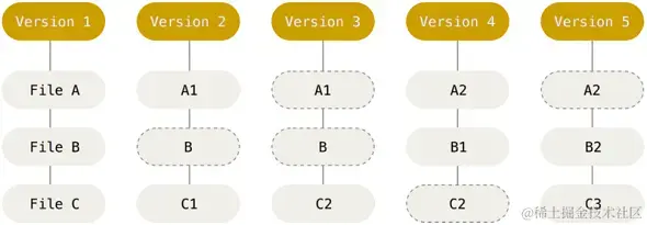 注:SVN等集中式版本控制系统存储每个文件与初始化版本的差异
